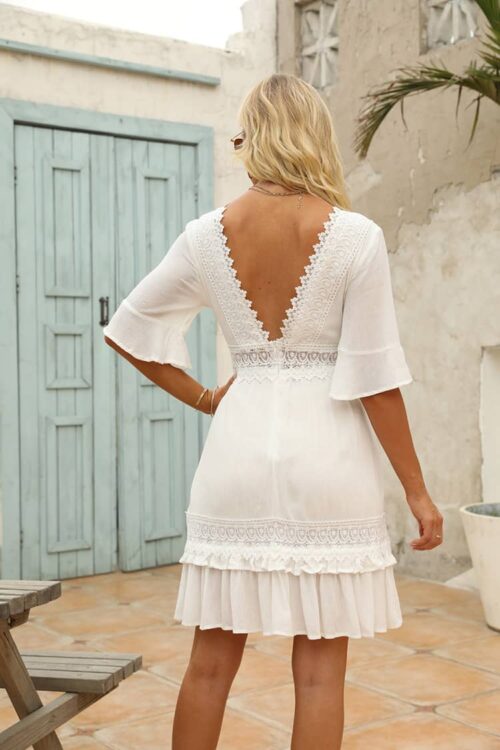 Le coloris blanc pur de la robe est rehaussé par des empiècements de dentelle délicats, ajoutant une touche de féminité et de douceur à votre look. Le dos nu de la robe ajoute une note de sophistication et de modernité, faisant de cette robe la pièce maîtresse de votre tenue.