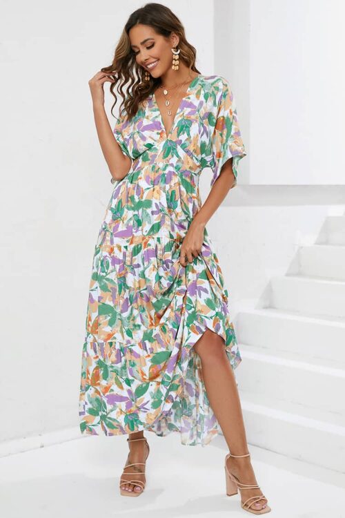 Le décolleté plongeant de cette robe sublime le buste et apporte une touche de séduction raffinée, tandis que la taille empire souligne la finesse de la taille et allonge la silhouette. Les manches évasées apportent une touche de légèreté et de fraîcheur à cette tenue, qui saura vous accompagner lors de vos balades en plein air ou de vos événements estivaux.